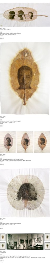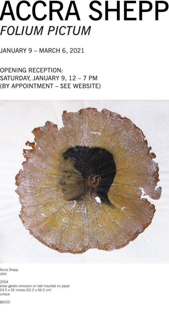 Accra Shepp has developed a unique process in his photography-based practice over the years, a captivating transformation of preserved tobacco and certain mammoth indigenous leaves into photoreactive materials. Onto these tanned, veined, physically huge but texturally fragile surfaces, Shepp enacts photographic portraits of the laborers who work these crops and farmlands. By grafting their images in such a physically integrated way, the image seems to emerge from within the leaf.
